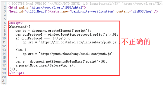 第三点网站的源代码部分里面出现了两个百度推送代码,这样是没有作用的而且有一个加着不正确所以我们选择把上面的删除掉精简代码。